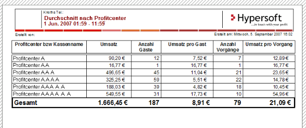 In der ersten Spalte wird Ihnen das Profitcenter angezeigt, dahinter der Umsatz des Profitcenter, so wie die Gästeanzahl und der Umsatz pro Gast.