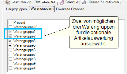 Die zehn Warengruppen wählen Sie durch anhaken aus. Um optional die drei Warengruppen zu bestimmen, deren Artikelbuchungen aufgelistet werden, klicken Sie diese Warengruppen erneut an. Der Haken und die Box werden dann grau gefärbt.