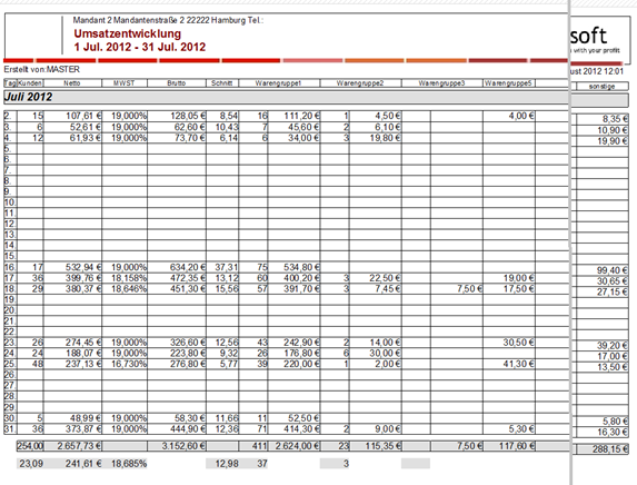 Der Bericht listet die Kundenanzahl (nur die Variante Erfassung am Hypersoft POS), Netto, Brutto, MwSt.-Satz und Kundendurchschnitt anhand des Bruttoumsatz auf. Zusätzlich erscheinen die gewählten Warengruppen, wobei die ersten drei zusätzlich mit der Artikelanzahl aufgelistet werden können. Für jeden Monat erfolgt ein Blatt welches in der Fußzeile die Summen und Durchschnitte ausgibt.