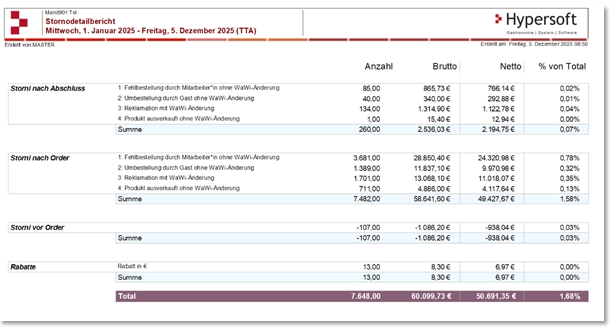 Der Stornodetailbericht stellt Stornobuchungen gruppiert nach Stornotypen dar und unterteilt diese zusätzlich nach den jeweils verwendeten Stornogründen.