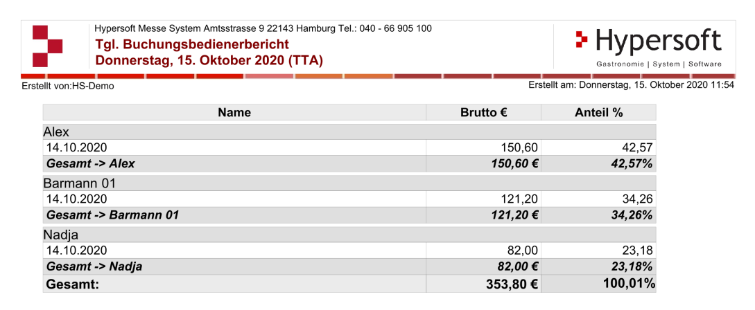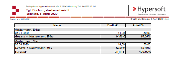 Ein Bedienerbericht, sortiert nach Buchungsbediener mit der Unterteilung pro Tag.