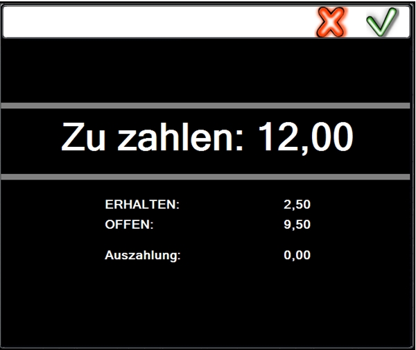 Bei einer Unterzahlung und Abbruch des Zahlungsvorgangs, wird (im Vorgang) eine entsprechende Zwischenzahlung gebucht, so dass der Restbetrag vorerst offen bleibt. Der Bediener und der Kunde haben jetzt die Möglichkeit die Restzahlung mit einer beliebigen Zahlungsart vorzunehmen.