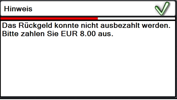 In einem Fall, bei dem der CashCONTROLLER das Rückgeld nicht auszahlen kann, erhält der Bediener einen entsprechende Meldung im Kassiermodus.
