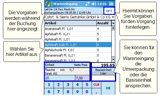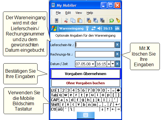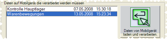 Nachdem Sie den Wareneingang erfasst haben, verbinden Sie das Gerät mit Ihrem MCP und starten dort das stationäre Mobile Control Programm. Die erfassten Warenbewegungen werden zum Herunterladen angeboten.
