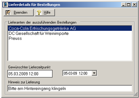 Bei der Übernahme der Bestellungen in das stationäre Mobile Control Programm wird Ihnen ein Dialog angeboten, mit dem Sie den gewünschten Lieferzeitpunkt und einen Bemerkungstext hinzufügen können.