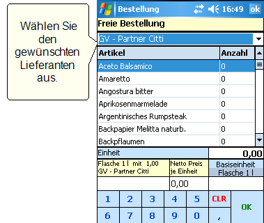 Mit Freie Bestellungen am Mobile Control können Sie Bestellungen an Lieferanten erstellen. (Frei deshalb, weil diese Bestellungen nicht anhand von Sollbeständen automatisch erzeugt werden).