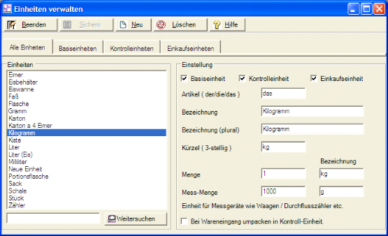 Hiermit können Sie Einheiten individuell benennen. Definieren Sie Einheiten und weisen Sie diese den Artikeln zu.