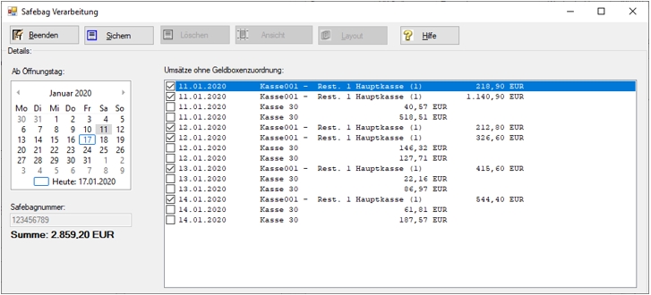 Die Safebag Verarbeitung ist ausschließlich für Kassen oder Systeme ohne eine Behälterzuordnung und Wechselgeldverarbeitung vorgesehen. Safebags sind häufig eindeutig nummerierte Einwegbeutel oder Ähnliches.