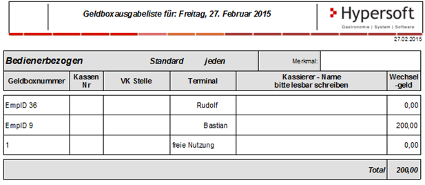 Diese Option wird nicht von Wallet-Control unterstützt. Mit dieser Option kann die Bearbeitung der Summe im Bereich Wechselgeld freigegeben werden. Das heißt das Wechselgeld kann an der Kassenstation zum Schichtbeginn vorgegeben werden. Diese Variante ist bei der Zuordnung zu Kassenstationen nicht möglich. Bei festen Vorgaben wird der Betrag am POS nur zur Bestätigung angezeigt. Behälterbelege werden bei der Bedienerabrechnung nur dann gedruckt, wenn diese variable Variante genutzt wurde. |