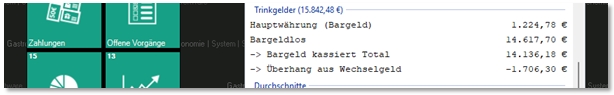 Übersteigen die unbar vereinnahmten Trinkgelder die tatsächlich erzielten Bareinnahmen, entsteht ein sogenannter Trinkgeld Überhang. Dieser wird in der Praxis in der Regel aus dem Wechselgeldbestand ausgeglichen. Ob der vorhandene Wechselgeldbestand hierfür ausreicht, wird im Finanzbericht selbst nicht bewertet. Die Steuerung und Kontrolle des Wechselgeldbestands kann bei Bedarf über Wallet Control erfolgen.