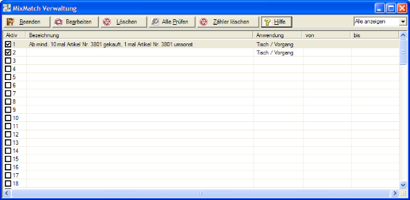 In der Liste treffen Sie Ihre Auswahl. Mit dem Haken in der Spalte Aktiv können Sie einzelne Matches aktivieren oder deaktivieren. Deaktivierte Matches nehmen nicht am MixMatch teil. Unter Anwendung sehen Sie für welche Vorgänge der MixMatch verwendet wird und von bis zeigt ob das Match zeitlich eingeschränkt gültig ist. |