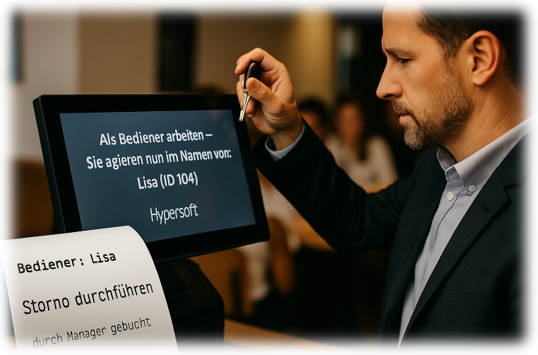 Mit dieser Funktion übernehmen Sie temporär die Bedienerkennung eines anderen Mitarbeitenden, aber behalten Ihre eigenen Rechte (z. B. Managerstatus oder Storno nach Abschluss).