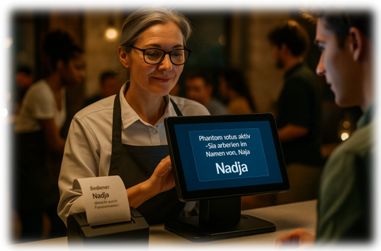 Der Phantommodus erlaubt es, Vorgänge anderer Bediener zu bearbeiten, ohne dass diese auf den Bon oder in die Abrechnung des helfenden Nutzers übergehen. Das System behandelt die Buchungen so, als hätte der ursprüngliche Bediener sie selbst durchgeführt – ideal für Aushilfen, Assistenz oder Notfälle.