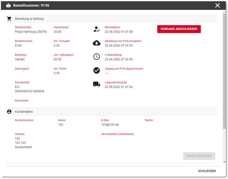 Für die manuelle Bestätigung müssen Sie die Schaltfläche Vorgang abschließen in den Bestelldetails einer Retail-Bestellung betätigen.