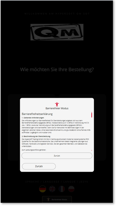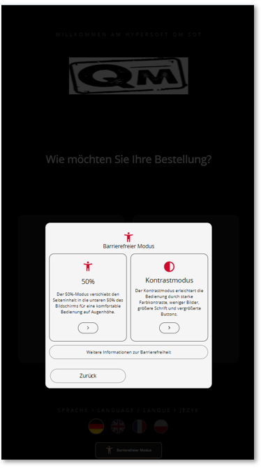 Für die Barrierefreiheit im SOT wird auf der Menu-Seite eine Barrierefrei Schaltfläche dann angeboten, wenn die Ordertypeseite übersprungen wird: