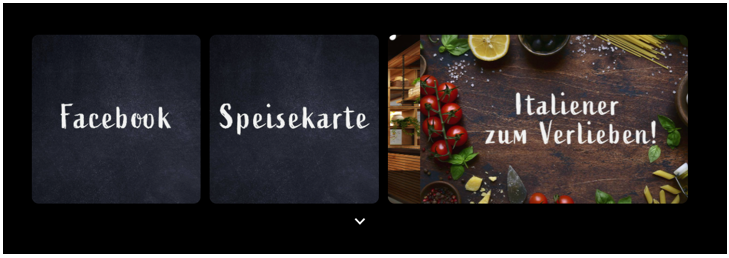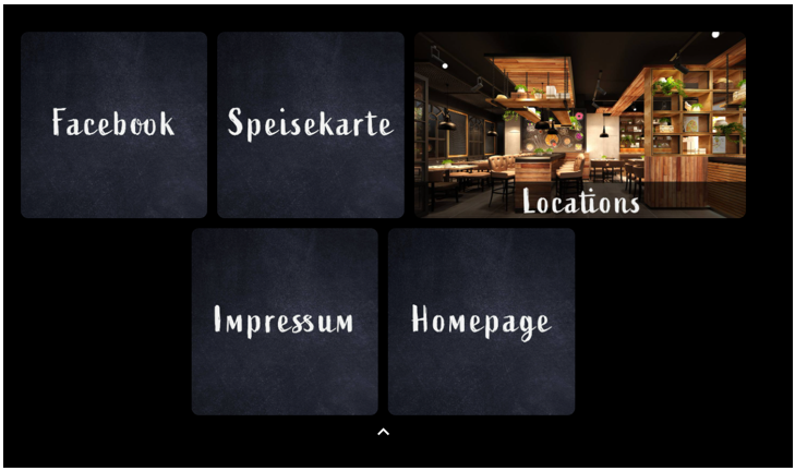 Kacheln / Tiles sowie die Priority Tile werden in der Desktop-Ansicht unterhalb der Bestelltypen angezeigt. Sollte sich aufgrund der Anzahl der angelegten Tiles mehr als eine Zeile ergeben, so können die weiteren Tiles vom User aufgeklappt werden (Sehen Sie auch Externe Links).