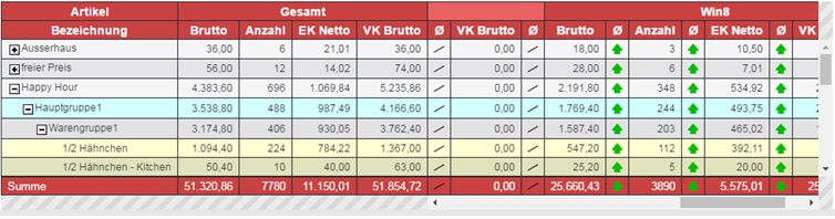 Die Tabelle passt sich automatisch den abgerufenen Daten an. Wird ein Layout der Layoutart Preisebenen gewählt und der Knopf Aktualisieren betätigt, so passt sich die Anzeige und die Datenübermittlungsstatus entsprechend an (beim Aufbau der Tabelle mit Preisebenen und Verlustgründen erhalten Sie eine zusätzliche Information über den Status der Datenübertragung bezüglich der Hauptgruppen).