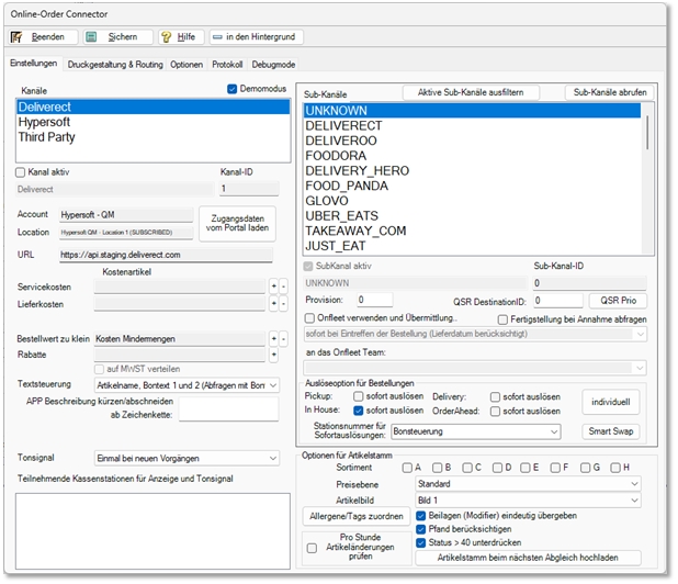 Starten Sie den Online-Order-Connector im MCP im Bereich Schnittstellendes jeweiligen Standortes. Dort können sodann die entsprechenden Kanäle & Subkanäle angelegt werden. Deliverect mit allen Sub-Kanälen ist ebenfalls vorgegeben. Für jeden Kanal gibt es Zugangsdaten die vom jeweiligen Anbieter vorgegeben werden (zuvor muss die Einrichtung im Hypersoft Portal abgeschlossen sein).