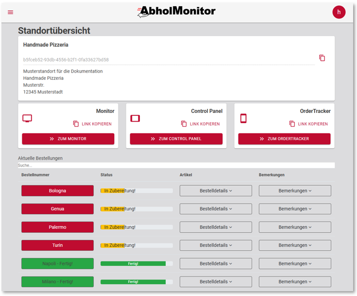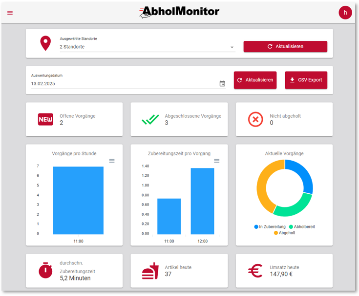 Das Abholmonitor Portal bietet Ihnen eine übersichtliche Echtzeit-Anzeige ihrer Standorte. Es ermöglicht aussagekräftige Auswertungen – von Bestellmengen pro Stunde bis hin zu durchschnittlichen Zubereitungszeiten. Mithilfe von Umsatz- und Artikel-Insights lassen sich Bestseller identifizieren und strategische Entscheidungen fundiert treffen. Eine zentrale Multi-Standort-Steuerung vereint sämtliche Filialen in einem einzigen Dashboard, während die flexible Export-Funktion auch rückwirkende Analysen erlaubt. Auf diese Weise entstehen optimierte Abläufe, erhöhte Transparenz und verbesserte Kundenzufriedenheit.