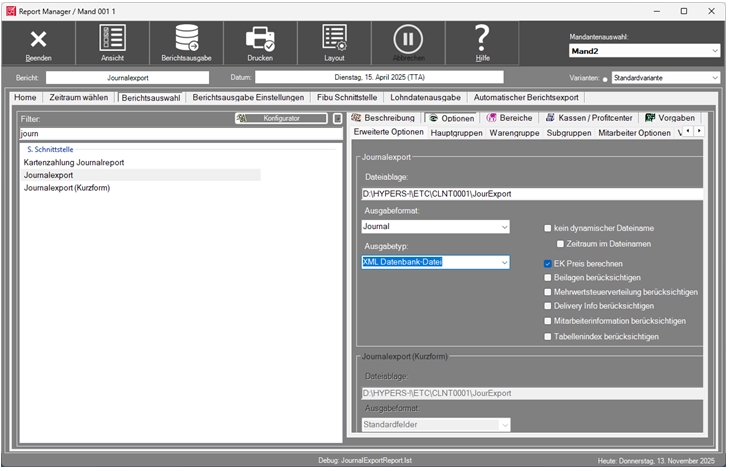 Der Journalexport kann im Report Manager auch automatisiert werden, sehen Sie dort Journalexport.