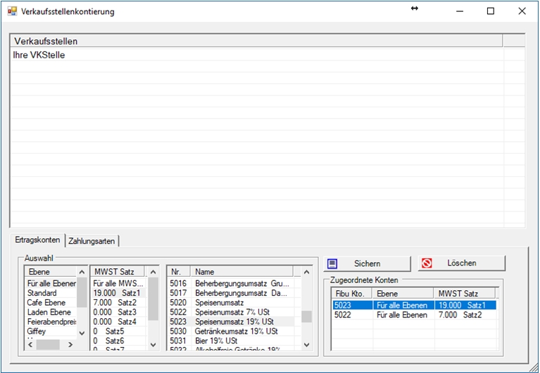 Wenn sie die Kontierung ihrer Umsätze (Ertragskonten) nicht pro Warengruppe benötigen, können Sie die Kontierung auf Basis der Verkaufsstellen einrichten. Somit können dann optional pro Preisebene und MwSt.- Satz je Verkaufsstelle die Kontierungen vorgenommen werden.