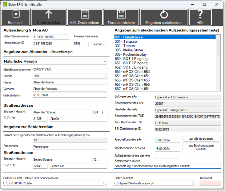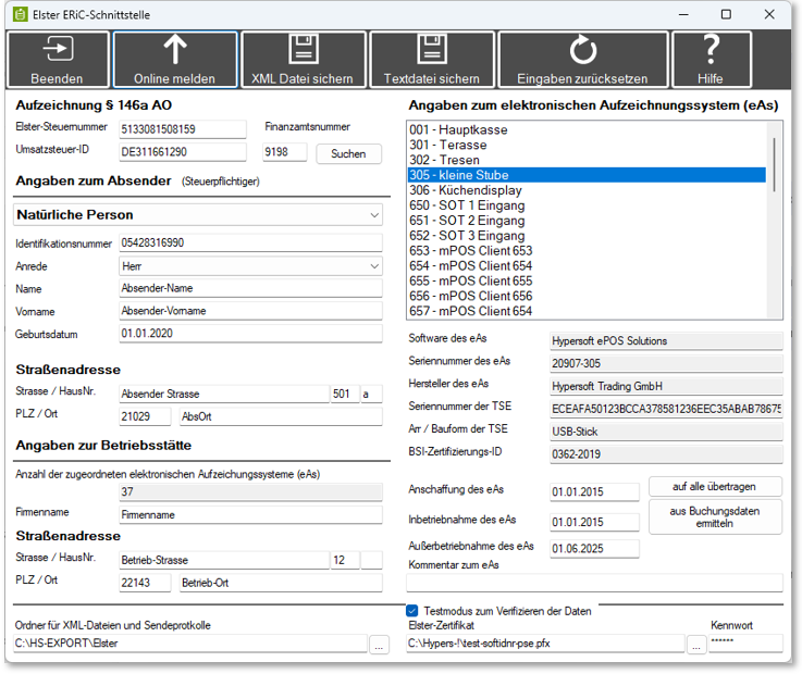 Diese Methode übermittelt die Informationen direkt an ELSTER. Nach erfolgreicher Übertragung wird eine Empfangsbestätigung angezeigt. Sollten Übertragungsfehler auftreten, werden diese unmittelbar gemeldet.