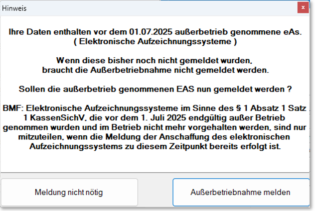 Wird für ein eAs ein Außerbetriebnahmedatum vor dem 01.07.2025 eingetragen, so wird eine Sonderregelung des BMF abgefragt. Sofern die betroffenen Station bisher nicht angemeldet wurden, brauchen sie auch nicht „abgemeldet“ werden.