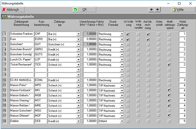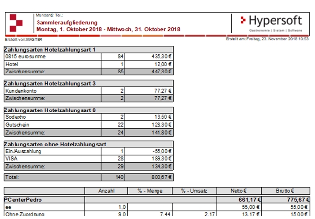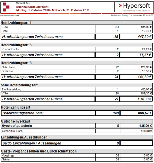 Für die Auswertung brauchen Sie keine speziellen Berichte, da die Zahlungsart auf Zimmer und andere Standards in den vorhandenen Berichten automatisch eingefügt werden. Die Buchhaltungsübersicht ermöglicht Ihnen eine erweiterte Auswertungen mit Sammleraufgliederung. Beispiel für die Nutzung der Hotel Zahlungsart: Die Buchhaltungsübersicht listet diese automatisch auf, wenn mindestens zwei unterschiedliche Zahlungsarten in der Währungstabelle eingerichtet sind.