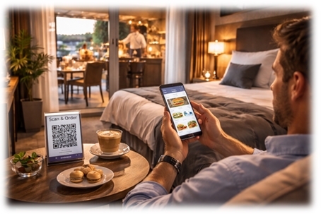 Ein QR-Code im Zimmer oder in zentralen Bereichen ermöglicht einen direkten Zugang zur Web-App – ohne Installationshürde. Die Anwendung läuft browserbasiert, verhält sich jedoch wie eine native App, damit sinkt die Nutzungsbarriere erheblich.