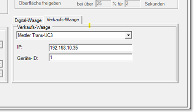 Die Mettler Toledo Waage kann hier für den eingerichtet werden. Hierfür müssen lediglich die IP-Adresse und die Geräte-ID der Waage eingegeben werden. Wenn die Waage so konfiguriert ist, dass die Daten bei jedem Verkauf auf der Waage gespeichert werden, kann die Kasse die Daten per FTP auslesen.