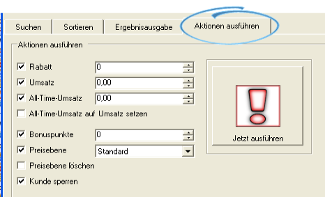 Wenn Sie mit Kundenlisten arbeiten erhalten Sie das Register Aktionen ausführen. Hiermit können Sie beliebig viele ausgewählte Daten hingehend bestimmter Informationen, wie zum Beispiel Rabatte oder Bonuspunkte, effizient in einem Arbeitsschritt bearbeiten.