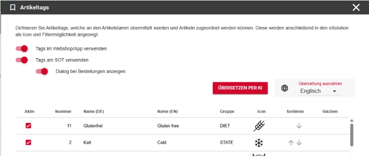 Mit der Schalfläche Übersetzen per KI können alle Tags auf einmal übersetzt werden (eine Einzelbearbeitung ist im Dialog „Artikel Detail“ möglich).
