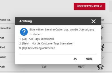 Nach dem Auswählen der Fremdsprache und Übersetzen per KI auswählen können Sie auswählen , ob nur Customer- oder alle Artikel Tags übersetzt werden sollen.