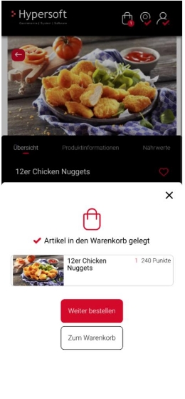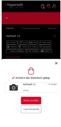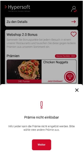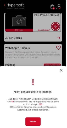 Versucht der Benutzer, ein weiteres Benefit aus derselben Aktion einzulösen, obwohl sich bereits ein entsprechender Artikel im Warenkorb befindet und die Punkte nicht ausreichen, wird ein entsprechender Hinweis angezeigt.
