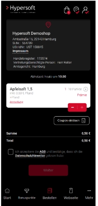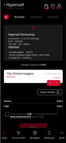 Hinweis: Die Punkte werden erst nach Abschluss der Bestellung tatsächlich abgebucht. Die Benutzeroberfläche zeigt den Punkteabzug bereits vorher an, um Mehrfacheinlösungen zu verhindern. Im Warenkorb ist das Produkt mit „Prämie“ gekennzeichnet.
