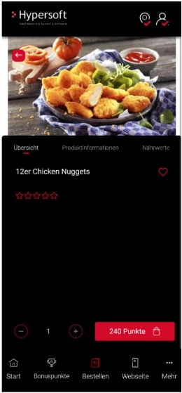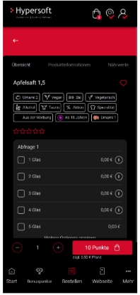 Ein Benefit kann nur einmal pro Bonusaktion eingelöst werden, auch wenn mehr Punkte vorhanden sind. Im Detailbereich des Benefit-Produkts sind Plus- und Minus-Buttons deaktiviert, da das Produkt nur einmal gebucht werden kann. Um das Benefit erneut zu buchen, muss es erneut über das Bonussystem aufgerufen werden.