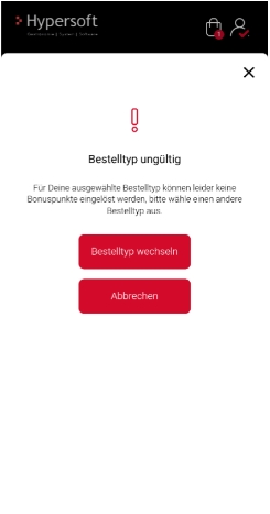 Wurde vorab ein Bestelltyp gewählt, für den das Einlösen von Benefits nicht erlaubt ist, erfolgt folgender Ablauf: