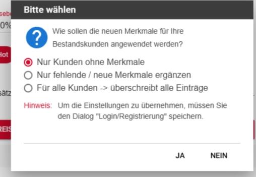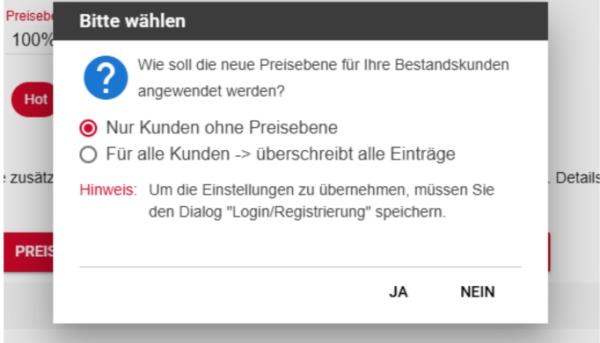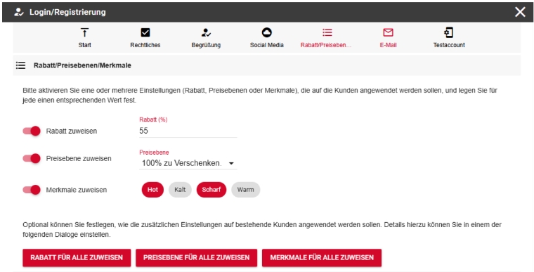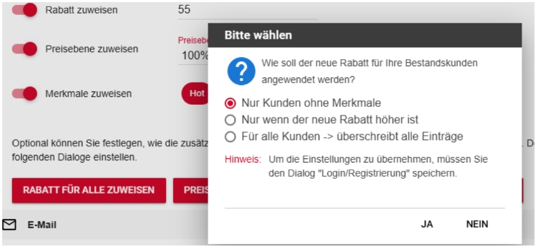 Mit der Schaltfläche „Rabatt, Preisebene oder Merkmale für alle zuweisen“ kann festgelegt werden, ob und wie die aktuellen Einstellungen auch auf bestehende (verifizierte) Kunden angewendet werden sollen.