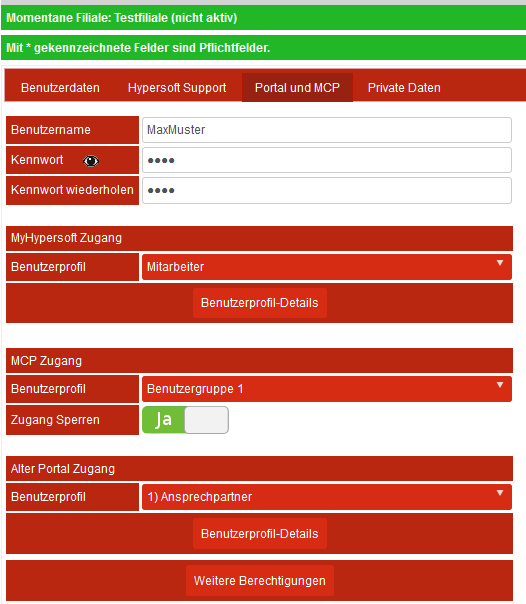Für Zugang zum Portal oder MCP werden Benutzername und Kennwort benötigt. Der Benutzer kann sich erst am MCP anmelden, wenn auch ein passendes Benutzerprofil ausgewählt wurde. Mit dem Schalter Zugang sperren können Sie den MCP Zugang jederzeit sperren ohne das die Anmeldedaten entfernt werden müssen (dies ist zum Beispiel praktisch, um Mitarbeiten vollständig anzurichten, aber erst nach einer Schulung zu aktivieren). Die E-Mailadresse zur Kommunikation mit dem Hypersoft Support kann anstelle des Benutzernamens zum Einloggen (aber bisher nur am neuen Portal) verwendet werden.