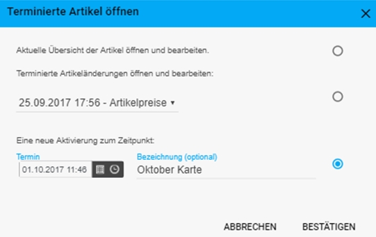 Beim Öffnen der Artikelpreise wird im Fall einer bereits geplanten Änderung, welche noch nicht zur Übertragung an die Kasse freigegeben wurde, diese zur Weiterbearbeitung angeboten. Alternativ können Sie eine neue Preisänderung vornehmen, oder diese bereits für ein Ausführungsdatum anlegen.