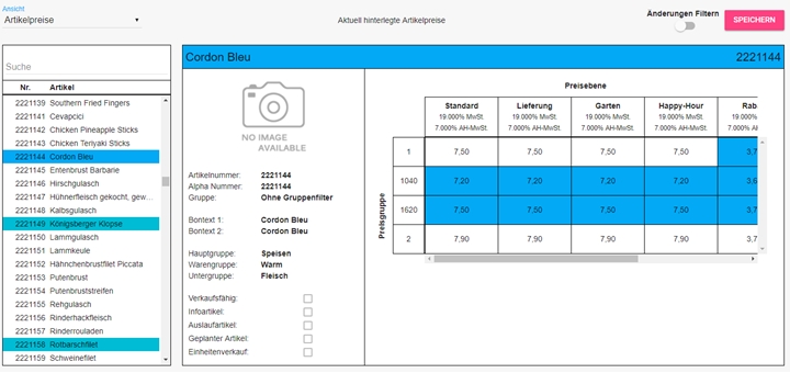 Preisänderungen werden beim Verlassen des jeweiligen Feldes farblich hervorgehoben. Bitte beachten Sie, dass ausschließlich Änderungen gespeichert werden.