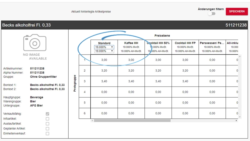 In den Kopfzeilen der Preisebenen können Sie den Mehrwertsteuersatz eines Artikels für alle Preisgruppen mittels einer Auswahl bestimmen.